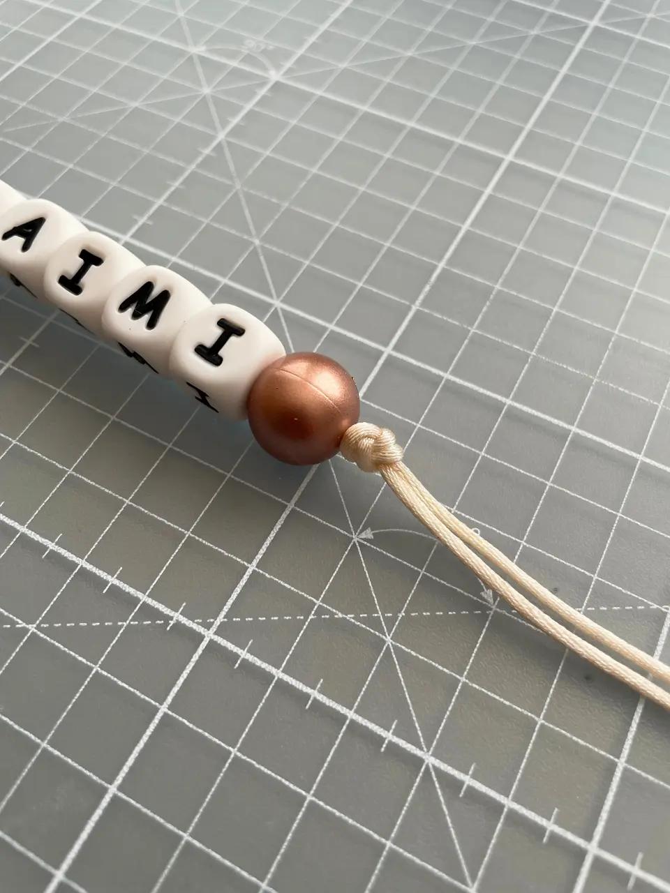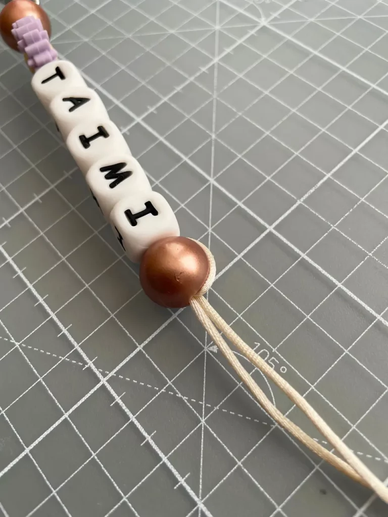 Nimikoitu avaimenperä on kätevä apuri repun tai avaimien nimikoimiseen. Avaimenperä nimellä on helppo ja nopea valmistaa itse tämän ohjeen avulla. Viimeinen helmi on varmistettu ylimääräisellä lenkillä, jotta se ei pääse karkaamaan solmun yli.